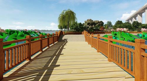 依托現(xiàn)狀地形地貌,打造親水平臺,結(jié)合用地規(guī)劃打造條狀小游園。